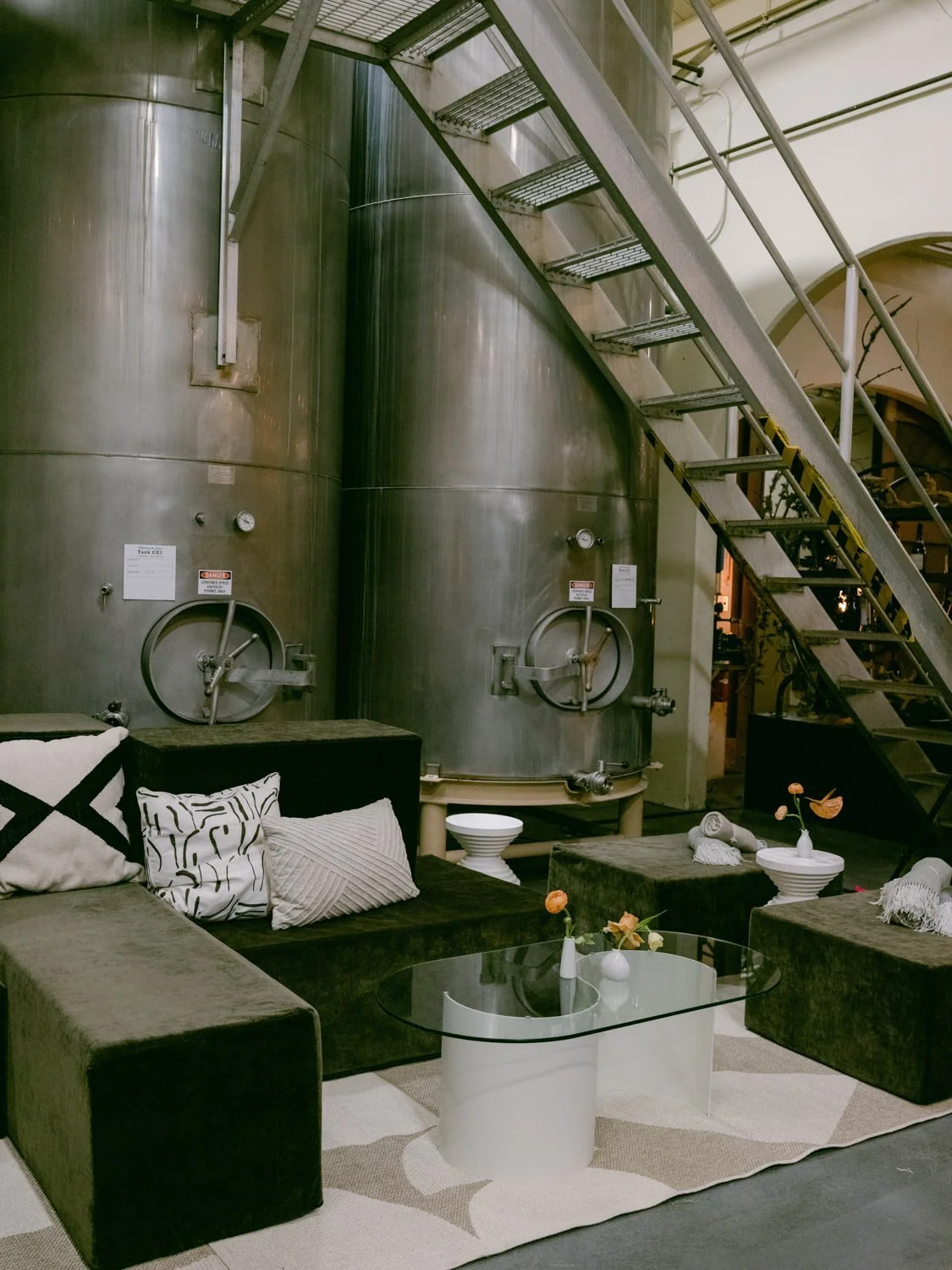 Stylish lounge area at the Sonoma, CA Be Sage conference held in a winery barrel room, designed by Rocket Science Events, photo by Radostina Boseva